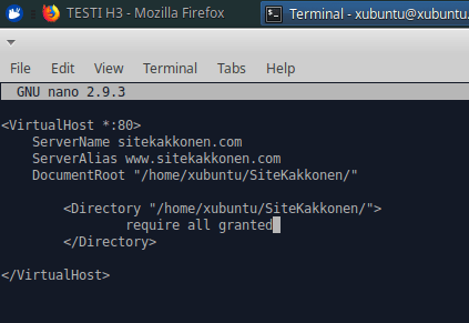 Aloitin luomalla toisen kansion ”SiteKakkonen” /home/xubuntu sijaintiin, jonka sisälle loin myös uuden index.html-tiedoston. Tämän jälkeen loin Apachen sites-available kansioon toisen .conf-tiedoston, johon kirjoitin kuvan mukaisen sisällön.