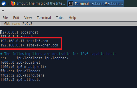 Tämän jälkeen laitoin .conf tiedoston päälle komennolla ”sudo a2ensite sitekakkonen.com.conf”. Käynnistin Apache-demonin uudestaan, jotta muutokset tulisivat voimaan. Tämän jälkeen lisäsin /etc/hosts -tiedostoon kuvan mukaiset IP-osoitteet ja domainit.