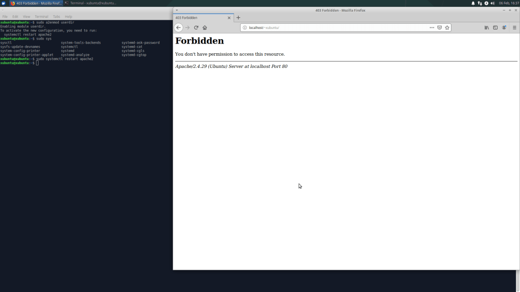 Aloitin käyttäjien kotisivujen luonnin pistämällä päälle userdir-moduulin komennolla ”sudo a2enmod userdir”, jonka jälkeen käynnistin Apachen myös uudelleen komennolla ”sudo systemctl restart apache2”, jolloin tekemäni muutos tuli voimaan. Kirjoittamalla Firefoxin osoitekenttään localhost/~xubuntu/, esille tuli sivu, joka antoi 403 Forbidden -virheen.