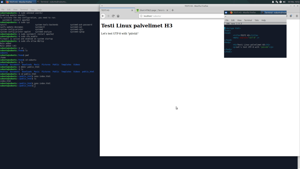 Tämä johtunee siitä, että en ole vielä tehnyt varsinaista nettisivua käyttäjälle. Navigoin itseni kansioon /home/xubuntu, jonne voin tehdä haluamani kansion ja tiedostot nettisivua varten. Loin kansioon ”public_html” nimisen kansion, jonka sisään loin vielä ”index.html” nimisen tiedoston. Kyseiseen tiedostoon kopioin lyhyen html5-pohjan osoitteesta: http://terokarvinen.com/2012/short-html5-page, jonka jälkeen tein pohjaan vielä haluamani muutokset. Tallensin muutokset ja päivitin selaimen välilehden, jossa 403 error aikaisemmin oli. Voilà!