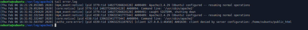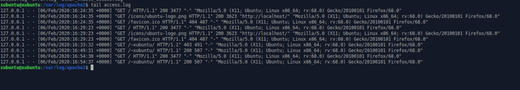 Siirryin takaisin root-kansioon, josta komennolla ”cd /var/log/apache2” pääsin kansioon, jossa Apachen lokitiedostot olivat. Tarkastelin ensin access.logia komennolla ”tail access.log”, jolloin sain kymmenen viimeisintä tapahtumaa lokitiedostosta. Analysoin viimeisimpää riviä. locahost IP-osoite rivin alussa kertoo pyynnön lähteen, tämän jälkeen seuraa timestamp hakasuluissa. ”GET” todennäköisesti merkitsee pyyntöä ja sen seuraama /~xubuntu/ pyynnön kohdetta. HTTP/1.1 määrittää kyseisen protokollan olevan käytössä. Luku 200 kuvaa onnistunutta toimintoa ja luku 507 vastauksen kokoa tavuissa (mikäli muistin oikein…). Loppuosa rivistä kertoo tietoja pyynnön tehneen laitteen selaimesta ja käyttöjärjestelmästä.
