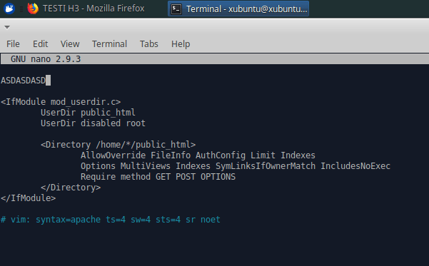 Navigoin itseni sijaintiin, josta Apachen asetustiedostot löytyvät komennolla ”cd /etc/apache2”, josta siirryin vielä ”mods-available/” kansioon. Täällä tein muutoksen userdir.conf-tiedostoon komennolla ”sudoedit userdir.conf” ja lisäsin tiedostoon tekstin ”ASDASDASD”.