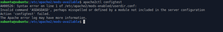 Tämän jälkeen ajoin komennon ”apache2ctl configtest”, joka palautti virheellisen asetustiedoston sijainnin ja ongelmakohdan plaintextinä.
