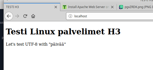 Tämän jälkeen laitoin vielä uuden .conf-tiedoston päälle komennolla ”sudo a2ensite testih3.com.conf” ja otin samalla default-sivun .conf-tiedoston pois komennolla ”sudo a2dissite 000-default.conf”. Tämän jälkeen käynnistin Apache-demonin vielä uudelleen komennolla ”sudo systemctl reload apache2”, jonka jälkeen käyttäjän sivu näkyi pelkällä ”localhost”-osoitteella.
