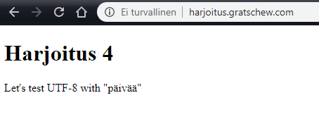 Tämän jälkeen tein vielä reiän palomuuriin, jotta verkkosivuun pääsisi käsiksi komennolla ”sudo ufw allow 80/tcp”. Asensin Apachen ja konfiguroin sen samaan tapaan kuin aikaisemmin tekemässäni harjoituksessa (https://tgratschew.news.blog/2020/02/06/linux-palvelimet-ict4tn021-3010-harjoitus-3/). Jolloin sain verkkosivun näyttämään lyhyen liittämäni (http://terokarvinen.com/2012/short-html5-page) html5-tiedoston haluamallani osoitteella.
