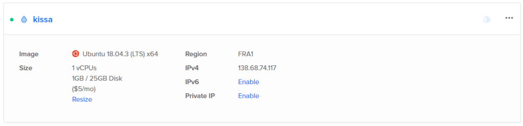 Loin aluksi DigitalOceanissa uuden dropletin. Valitsin halvimman mahdollisen virtuaalipalvelimen, sillä sen teho on riittävä tehtävään. Vaihdoin myös palvelimen sijainnin Frankfurttiin. Tämän jälkeen odotin palvelin luonnin viimeistelyä. Palvelimen tullessa päälle otin siihen SSH-yhteyden komennolla ”ssh root@138.68.74.117”, jonka jälkeen syötin terminaaliin sähköpostiin saamani väliaikaisen salasanan ja vaihdoin tämän jälkeen uuden salasanan tämän tilalle.