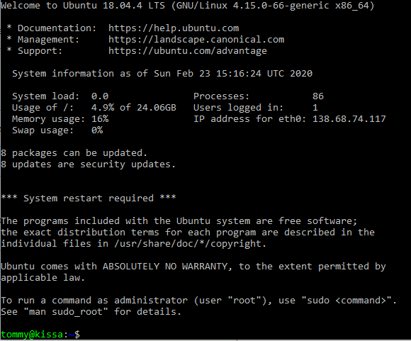 Seuraavaksi konfiguroin palvelimen. Laitoin palomuurin päälle komennoilla ”sudo ufw allow 22/tcp” ja ”sudo ufw enable” (tässä järjestyksessä, jotta ssh yhteys ei katkeaisi palomuuria käynnistettäessä). Tämän jälkeen lisäsin palvelimelle uuden käyttäjän ”tommy” komennolla ”sudo adduser tommy”, jonka jälkeen lisäsin uuden käyttäjän myös sudo-ryhmään komennolla ”sudo adduser tommy sudo”. Testasin vielä, että SSH-yhteyden ottaminen toimi ennen kuin poistin root-käyttäjän käytöstä. Otin uuden SSH-yhteyden palvelimeen komennolla ”ssh tommy@138.68.74.117”, jonka jälkeen syötin vielä salasanan ja sain palvelimeen etäyhteyden käyttäjän tunnuksilla. Poistin tämän jälkeen root-käyttäjän käytöstä komennolla ”sudo usermod –lock root” ja muutin SSH:n asetustiedostosta kohdan ”PermitRootLogin” yes -> no. Käynnistin myös ssh-palvelun uudelleen komennolla ”sudo service ssh restart”, jolloin tekemäni muutos tuli voimaan.