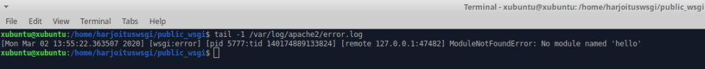 Kun Apachen konfiguraatiot olivat kunnossa tein uuden kansion komennolla ”sudo mkdir /home/harjoituswsgi/public_wsgi” ja korjasin vaadittavat ongelmat käyttöoikeuksien kanssa komennoilla ”sudo chown harjoituswsgi:harjoituswsgi /home/harjoituswsgi/public_wsgi” ja ”sudo chmod g=rwxs /home/harjoituswsgi/public_wsgi”. Komennolla ”ls -ld /home/harjoituswsgi/public_wsgi” näin, että kansion oikeudet olivat kunnossa. Jäin kuitenkin hieman ihmettelemään kohtaa ”40”, sillä esimerkissä tämän luvun kohdalla on luku 4096, jonka oletin viittaavan jollain tasolla muistiin tai tilaan. En kuitenkaan törmännyt mihinkään ongelmiin, joten annoin asian toistaiseksi olla (Mikäli ongelmia olisi ilmennyt olisin yrittänyt selvittää asiaa tarkemmin). Tehtyäni nämä muutokset localhost-osoitteen error-koodi muuttui 403 -> 404, josta pystyin päättelemään muutoksien toimineen halutusti. Tämän jälkeen loin uuden .wsgi-tiedoston komennolla ”nano /home/harjoituswsgi/public_wsgi/harjoitus.wsgi” ja uuden python-tiedoston komennolla ”nano hello.py” (sillä olin tällä hetkellä jo public_wsgi kansiossa), johon liitin saman python-ohjelman kuin aikaisemmassa tehtävässä (ilman app.run(debug=True) riviä). Jolloin verkkosivu näytti kirjoittamani lauseen! Testasin myös sivun päivittämistä ilman apachen uudelleenkäynnistämistä tekemällä muutoksen python-tiedostoon ja tämän jälkeen ajamalla komennon ”touch harjoitus.wsgi”, joka päivitti sivun sisällön uuteen.