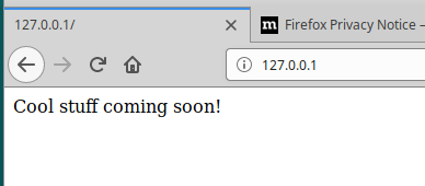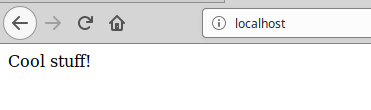Tämän jälkeen muutin default sivun sisällön komennolla ”echo ”Cool stuff coming soon!”|sudo tee /var/www/html/index.html”, jonka jälkeen valitsemani lause näkyi localhost-osoitteessa.