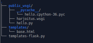b) Tuotanto-Flask. Tee tuotantotyyppinen asennus Flaskista käyttäen Apachen WSGI-moduulia. Kokeile, että pystyt muokkaamaan koodia ilman sudoa ja saat uuden version käyttöön käynnistämättä Apachea uudelleen. (‘touch foo.wsgi’).