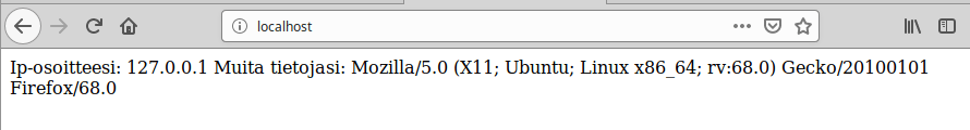 Päätin muokata jo olemassa olevaa hello.py -tiedostoa, jotta en joutuisi muokkaamaan myös esim. wsgi-tiedostoa. Muokkasin hello.py-tiedostoa komennolla ”nano hello.py” ja lisäsin import-riville requestin. Lisäsin tämän jälkeen hello-funktioon kaksi muuttujaa kayttaja ja iposoite, jotka poimivat käyttäjän IP-osoitteen ja muut tiedot. Lisäsin nämä muuttujat myös palautettavaan lauseeseen, jolloin sain lopputulokseksi seuraavan.