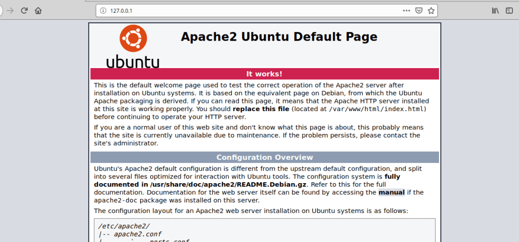 Aloitin asentamalla Apachen komennolla ”sudo apt-get install apache2” ja testasin sivun toimivuuden menemällä localhost-osoitteeseen verkkoselaimessa, joka näyttikin Apachen default-sivun.