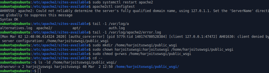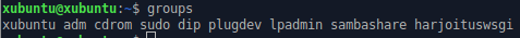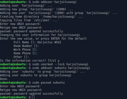 Tämän jälkeen loin uuden käyttäjän/ryhmän, jonka tarkoituksena on toimia esimerkiksi yhteisen projektin sijaintina ja johon voidaan lisätä ja poistaa käyttäjiä halutessa. Ensimmäiseksi loin käyttäjän ”harjoituswsgi” komennolla ”sudo adduser harjoituswsgi”. Syötin salasanan ja nimikenttään tiedot kenelle käyttäjä/ryhmä kuuluu (tässä tilanteessa laitoin tiedoksi tosin vain ”Harjoitus WSGI”, mutta normaalisti laitettaisiin esimerkiksi yhteyshenkilön nimi, joka on vastuussa kyseisestä projektista). Tämän jälkeen lukitsin käyttäjän komennolla ”sudo usermod –lock harjoituswsgi”, sillä keneenkään ei kuulu kirjautua suoraan käyttäjälle vaa tätä käytetään vain keskitettynä kansiona/sijaintina esim. projektissa (johon käyttäjät tekevät muutoksia omien tunnuksiensa kautta). Lisäsin vielä itseni luomaani ryhmään komennolla ”sudo adduser xubuntu harjoituswsgi”, jonka jälkeen asetin xubuntu-tilille salasanan. Kirjauduin ulos ja takaisisin sisään, jonka yhteydessä xubuntu-tili liitettiin harjoituswsgi-ryhmään.