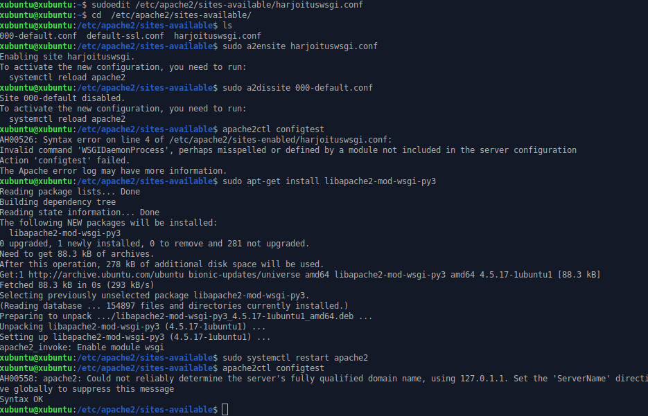 Aloitin luomalla uuden .conf-tiedoston komennolla ”sudoedit /etc/apache2/sites-available/harjoituswsgi.conf”. Tiedostoon liitin Tero Karvisen valmiin mallin (http://terokarvinen.com/2020/deploy-python-flask-to-production/), johon tein tarvittavat nimimuutokset yms. omaa käyttöäni varten. Tämän jälkeen tallensin tiedoston ja aktivoin sen komennolla ”sudo a2ensite harjoituswsgi.conf” ja otin samalla default .conf-tiedoston pois käytöstä komennolla ”sudo a2dissite 000-default.conf”. Asensin tämän jälkeen myös tarvittavan WSGI-moduulin komennolla ”sudo apt-get install libapache2-mod-wsgi-py3”, jonka jälkeen käynnistin Apache-demonin uudestaan komennolla ”sudo systemctl restart apache2”. Komennolla ”apache2ctl configtest” sainkin tämän jälkeen vastaukseksi ”Syntax OK”.