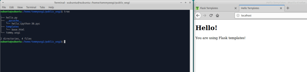 Loin aluksi harjoituswsgi-käyttäjän kotihakemistoon ohjeenmukaisen kansion, html-tiedoston ja python-tiedoston (http://terokarvinen.com/2020/flask-templates/), joihin liitin myös ohjeessa annetut sisällöt. Tämän jälkeen ajoin python-ohjelman komennolla ”python3 templates-flask.py” ja avasin verkkoselaimeen ohjelman antaman osoitteen (http://127.0.0.1:5000/), jolloin sain myös ohjeenmukaisen sivun näkynään