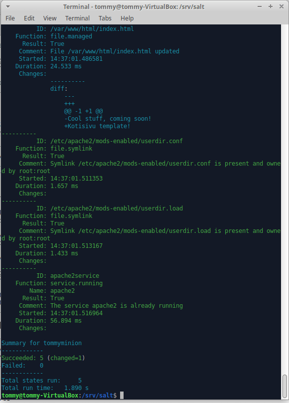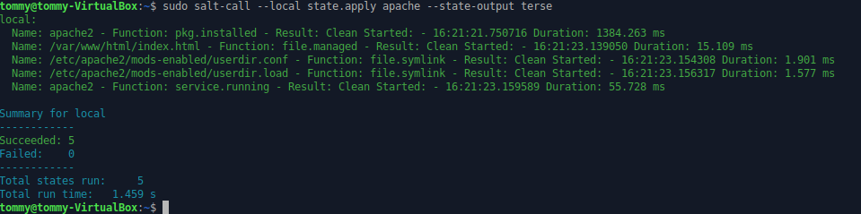 Päätin ajaa aikaisemmin luodun apache-tilan paikallisesti. Ajoin siis komennon “sudo salt-call --local state.apply apache --state.output terse”. Terminaalin tulostuikin tieto komennon ajamisen onnistumisesta. Debug-tulosteesta selviää läpikäydyt kohdat (apache.sls-tiedostosta). Ensimmäiseksi tarkistettiin, onko apache2-paketti asennettu. Tuloksena oli ”Clean Started”, josta voi päätellä paketin olleen asennettu ja käynnissä. Tämän jälkeen tarkistettiin Apachen default-verkkosivun tila, joka oli myös olemassa. Seuraavaksi symlinkkien tila, jotka olivat myös kunnossa ja viimeiseksi oliko palvelu käynnissä, joka palautti myös onnistuneen tilan.