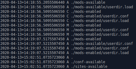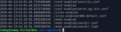 Etsin aikaisemmassa tehtävässä muutettuja Apachen tiedostoja. Navigoin itseni ensin Apachen asetuskansioon komennolla ”cd /etc/apache2/”, jonka jälkeen ajoin find-komennon ”find -printf ”%T+ %p\n”|sort”. Komento palautti muutokset muodossa muokkausaika (%T+) + tiedoston nimi polulla (%p) ja \n lopussa laittoi jokaisen tapahtuman uudelle/omalle rivilleen. |sort laittoi löydetyt muutokset ajallisesti siihen järjestykseen, että viimeisimmät muutokset olivat viimeisenä. Komennosta näkyi selvästi Apachen asentamisesta johtuneet muutokset (klo. 14:01 tehdyt muutokset) ja aikaisemmin ajetun ”sudo a2enmod userdir” -komennon tekemät muutokset (klo. 14:18 tehdyt muutokset), jossa ”mods-enabled” -kansioon on luotu symlinkit ”mods-available” kansiossa olevista moduuleista.