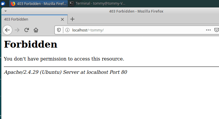 Tämän jälkeen enabloin userdir-moduulin komennolla ”sudo a2enmod userdir” ja käynnistin Apache-demonin uudestaan vielä komennolla ”sudo systemctl restart apache2”, jolloin tekemäni muutos tuli voimaan. Antamalla osoitteen localhost/~tommy/, sainkin näkyviin 403 Forbidden -virheen. Kyseinen virhe johtuukin mitä todennäköisimmin vain siitä, että käyttäjälle ei ole tehty vielä varsinaisia kotisivuja.