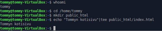 Testasin luoda käyttäjälle kotisivut. Navigoin itseni ensin käyttäjän kotihakemistoon komennolla ”cd /home/tommy”. Loin tänne public_html-kansion komennolla ”mkdir public_html” ja tämän sisälle index-html-tiedoston komennolla ”echo ”Tommyn kotisivu”|tee public_html/index.html”, joka palauttikin odotetusti tekstin ”Tommyn kotisivu”. Varmistin kuitenkin toimivuuden myös selaimen kautta, joka näytti myös toimivan halutusti.