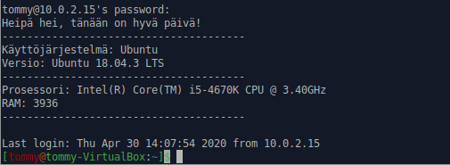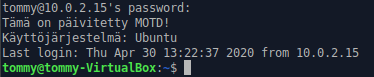 Tämän jälkeen ajoin tilan vielä komennolla ”sudo salt ’*’ state.apply sshd”, joka ilmoitti muutosten onnistuneen. Kirjauduin ssh:n kautta minionille komennolla ”ssh -p 8888 tommy@10.0.2.15” ja uusi motd näkyikin oikein.