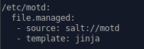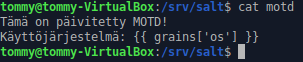 Päätin tehdä muoteilla mukautetun motd-viestin yhdistäessä minionille ssh:n avulla. Aloitin luomalla varsinaisen motd-tiedoston /srv/salt/ -hakemistoon komennolla ”sudoedit /srv/salt/motd”, johon kirjoitin seuraavan: