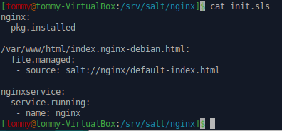 Tein uuden kansio /srv/salt/ -sijaintiin komennolla ”sudo mkdir nginx”, jonka sisälle loin .sls -tiedoston komennolla ”sudoedit init.sls”. Tiedoston sisälle kirjoitin seuraavan: