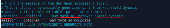 Poistin kaiken ylimääräisen motd:sta muokkaamalla sshd-määritystiedostoa komennolla ”sudoedit /etc/pam.d/sshd” ja kommentoimalla ulos rivin, jossa määritellään dynaamisesti luotu motd.