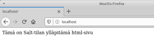 Tämän jälkeen loin myös samaan nginx-kansioon html-sivun komennolla ”sudoedit default-index.html”, johon kirjoitin satunnaisen lauseen. Tämän jälkeen ajoin tilan komennolla ”sudo salt ’*’ state.apply nginx”, joka suoritettiin onnistuneesti. Selaimella localhost-osoitteessa näkyy myös sisällön muuttuneen manuaalisesti määritellystä uuteen html-sisältöön.